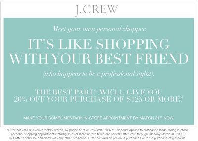 Naturally, the feeling of contentment didn't last long. Got an email from a friend who finally wanted to take me up on a shopping trip. I had contacted her previously about taking her shopping to help her revamp her wardrobe, now that she was getting married and approaching the big 3-oh in a year (ah, the young and carefree...). She offered to meet this weekend and go to J.Crew (at my suggestion). Debated on whether or not to risk it but decided that, if I shopped vicariously through her, it wouldn't count against me -- would it?